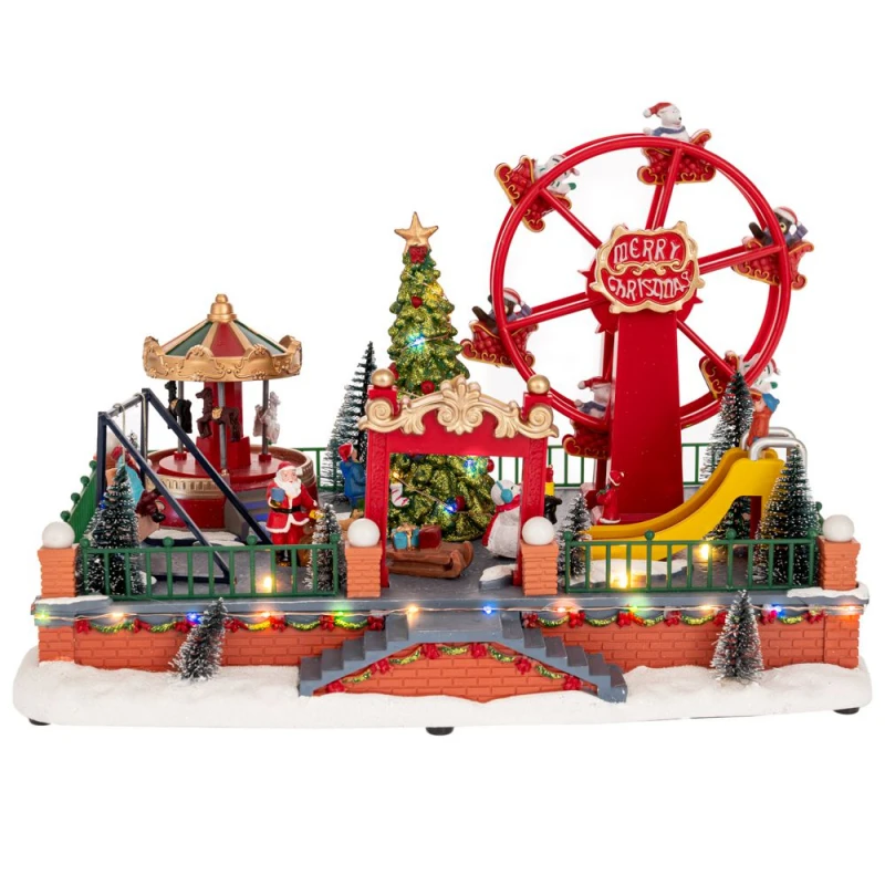 Χριστουγεννιάτικο εντυπωσιακό σκηνικό luna park με ρόδα, καρουσέλ και άλλα παιχνίδια. Γυρνάει γύρω-γύρω η ρόδα και το καρουζέλ και παίζει μουσική με 8 τραγούδια και έχει κουμπί on/off για την μουσική. Διαθέτει φωτάκια σε αρκετά σημεία.