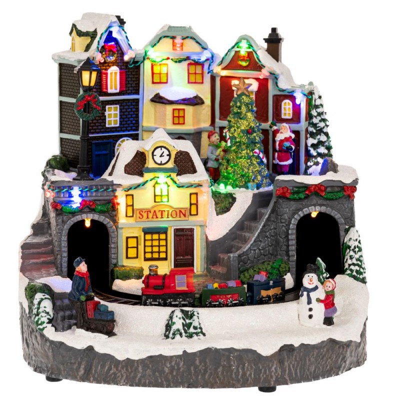 Χριστουγεννιάτικο εντυπωσιακό χωριό με πολλά φωτιζόμενα σπίτια και τρένο που γυρνάει γύρω γύρω, μέσα σε τούνελ. Εχει φως σε αρκετά σημεία και μουσική με 8 τραγούδια. Η μουσική έχει κουμπί On/Off. Λειτουργεί με ρεύμα με μετασχηματιστή 4.5V που περιέχεται. Υλικό κατασκευής πολυρεζίνη και πλαστικό. Πολύ καλή απεικόνιση και ποιότητα κατασκευής. Τo προιόν μπορεί να έχει μικρές χρωματικές διαφορές απο την φωτογραφία.