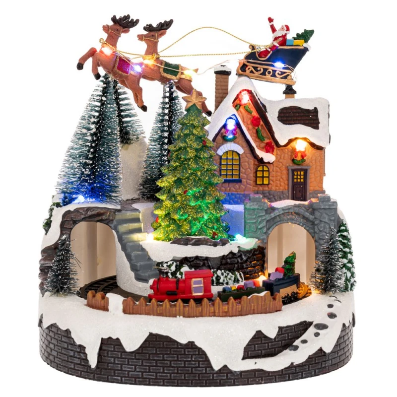 Χριστουγεννιάτικο φωτιζόμενο σκηνικό με τρενάκι που κινείται γύρω γύρω. Έχει ένα φωτιζόμενο σπιτάκι με χιονισμένα δέντρα και από πάνω είναι τοποθετημένος ο Άγιος Βασίλης μέσα στο έλκηθρο με τους ταράνδους. Λειτουργεί με 3 μπαταρίες ΑΑ οι οποίες δεν περιέχονται. Υλικό κατασκευής πολυρεζίνη και πλαστικό. Πολύ καλή απεικόνιση και ποιότητα κατασκευής. Τo προιόν μπορεί να έχει μικρές χρωματικές διαφορές απο την φωτογραφία.