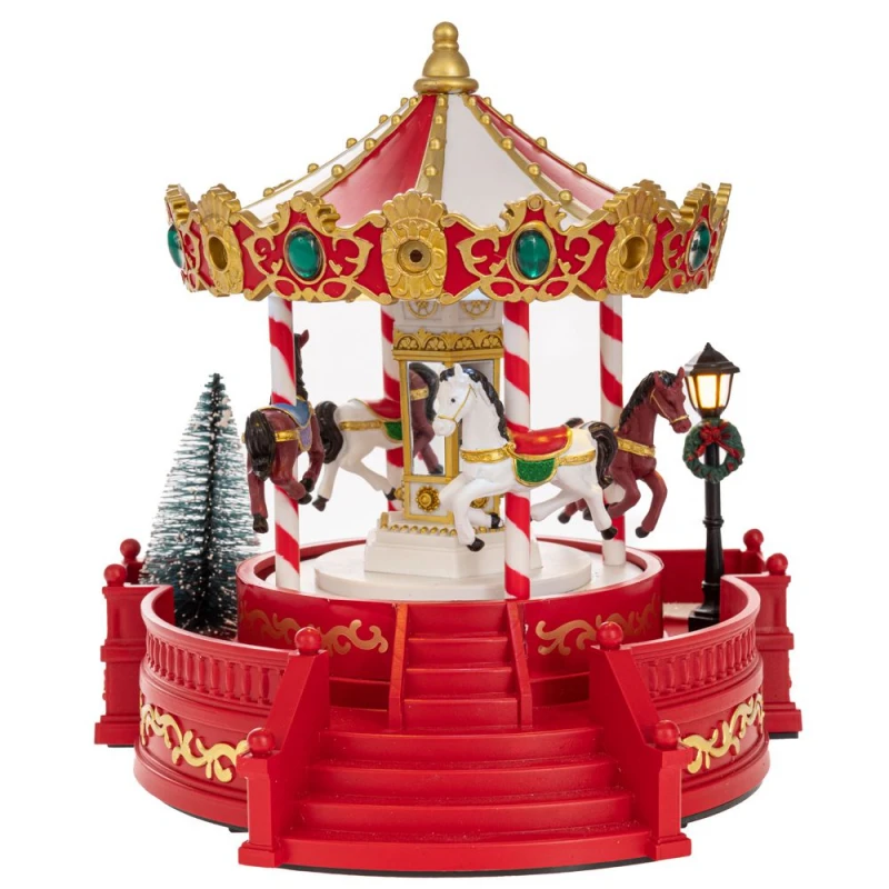 Χριστουγεννιάτικο καρουζέλ σε κόκκινο χρώμα. Η περίτεχνη κατασκευή του κοσμείται από χρυσές λεπτομέρειες. Στο κέντρο έχει μια διακοσμημένη κολώνα και γύρω γύρω γυρνάνε ανεβοκατεβαίνοντας λευκά και καφέ αλογάκια. Λειτουργεί με 3 μπαταρίες ΑΑ οι οποίες δεν περιέχονται. Υλικό κατασκευής πολυρεζίνη και πλαστικό. Πολύ καλή απεικόνιση και ποιότητα κατασκευής. Τo προιόν μπορεί να έχει μικρές χρωματικές διαφορές απο την φωτογραφία.