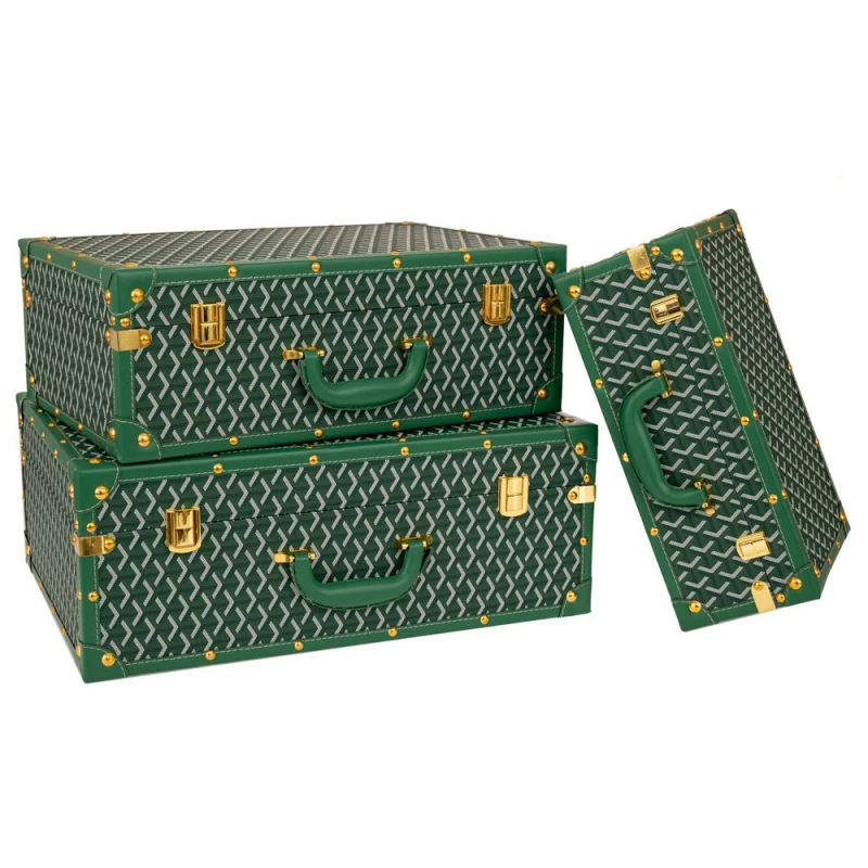 Διακοσμητικές βαλίτσες σετ των 3 τεμαχίων. Είναι επενδυμένες με πράσινο καρό ύφασμα και διακοσμημένες με πράσινες δερμάτινες λεπτομέρειες καθώς και χρυσά μεταλλικά κλειδώματα που προσθέτουν στυλ και κομψότητα.
