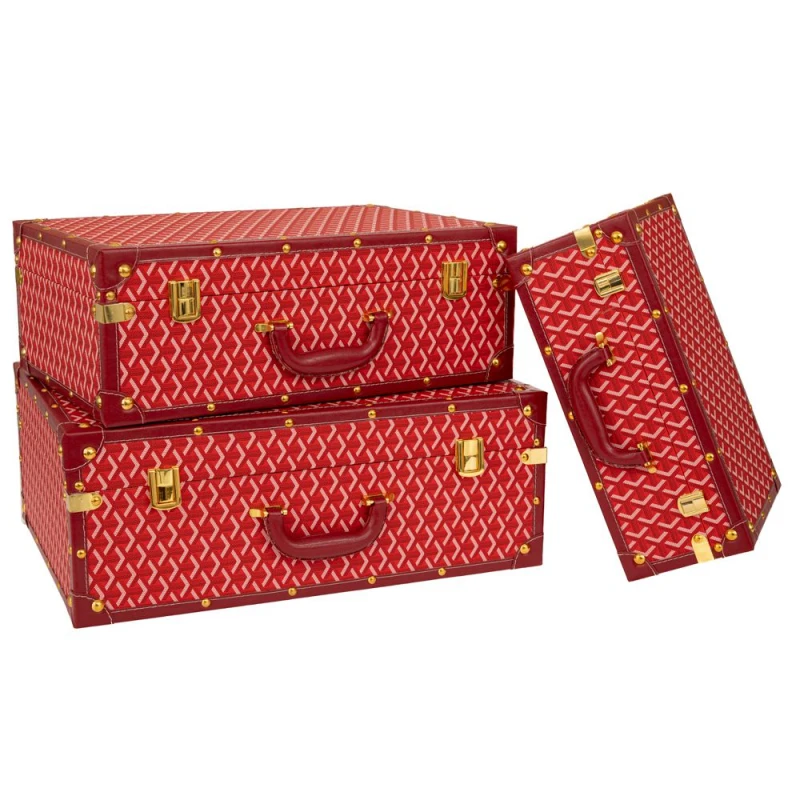Διακοσμητικές βαλίτσες σετ των 3 τεμαχίων. Είναι επενδυμένες με κόκκινο καρό ύφασμα και διακοσμημένες με κόκκινες δερμάτινες λεπτομέρειες καθώς και χρυσά μεταλλικά κλειδώματα που προσθέτουν στυλ και κομψότητα.