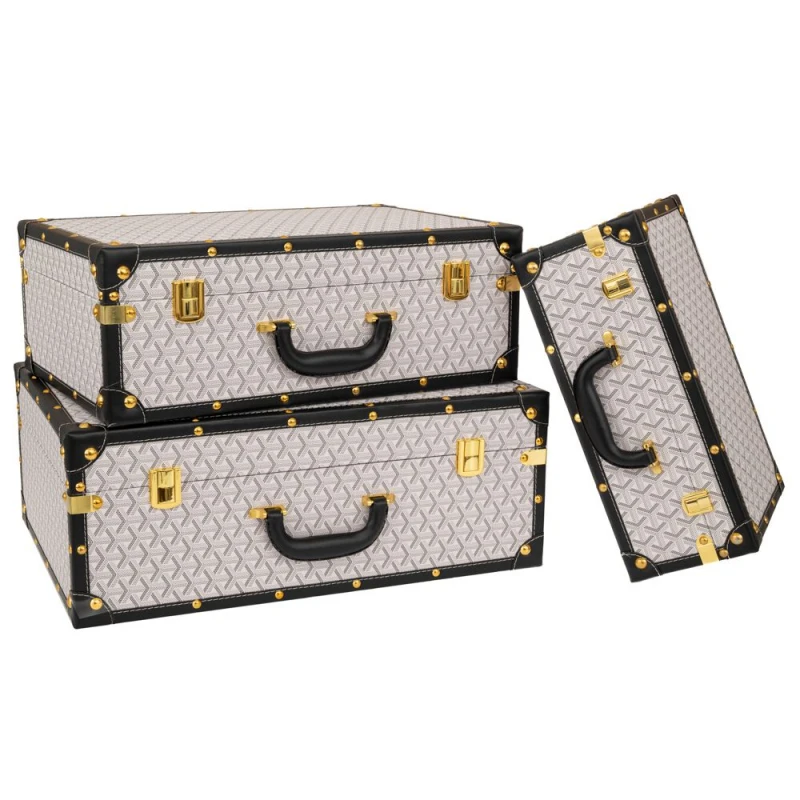 Διακοσμητικές βαλίτσες σετ των 3 τεμαχίων. Είναι επενδυμένες με απρόμαυρο καρό ύφασμα και διακοσμημένες με μαύρες δερμάτινες λεπτομέρειες καθώς και χρυσά μεταλλικά κλειδώματα που προσθέτουν στυλ και κομψότητα.