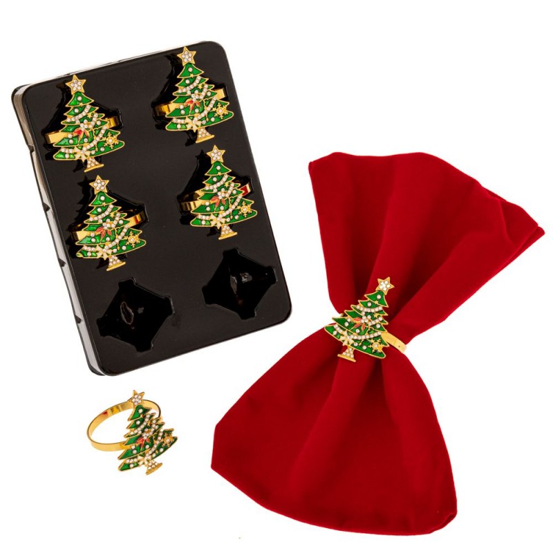 Σετ 6τμχ Χριστουγεννιάτικα δαχτυλίδια πετσέτας μεταλλικά σε χρυσό χρώμα με πράσινο δεντράκι από την iliadis.