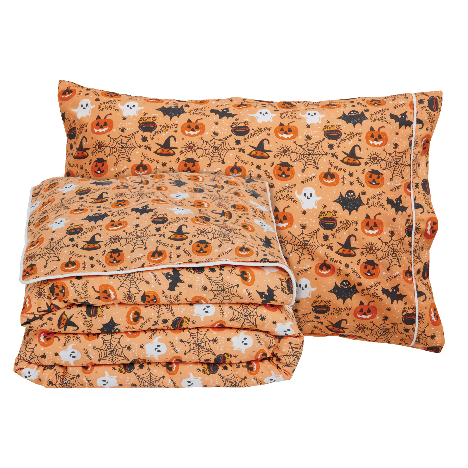 Σετ σεντόνια της σειράς Kid, σε σχέδιο Halloween. Είναι από 70% υποαλλεργικό βαμβάκι και 30% πολυεστέρα με πυκνότητα ύφανσης 150 TC, απαλό στην αφή & ανθεκτικό στη χρήση. Το σετ περιλαμβάνει ένα πανωσέντονο 170Χ260εκ, ένα κατωσέντονο 170X260εκ και μία μαξιλαροθήκη 50x70εκ. Das home...makes your house a home!
