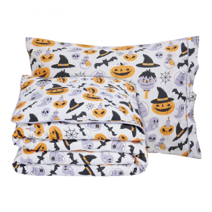 Σετ παπλωματοθήκη της σειράς Kid, σε σχέδιο Halloween. Είναι από 70% υποαλλεργικό βαμβάκι και 30% πολυεστέρα με πυκνότητα ύφανσης 150 TC, απαλή στην αφή, ανθεκτικό στη χρήση και με ειδική επεξεργασία για εύκολο σιδέρωμα. Το σετ περιλαμβάνει μία παπλωματοθήκη διάστασης 160Χ240εκ και μία μαξιλαροθήκη 50Χ70εκ. Das home...makes your house a home!