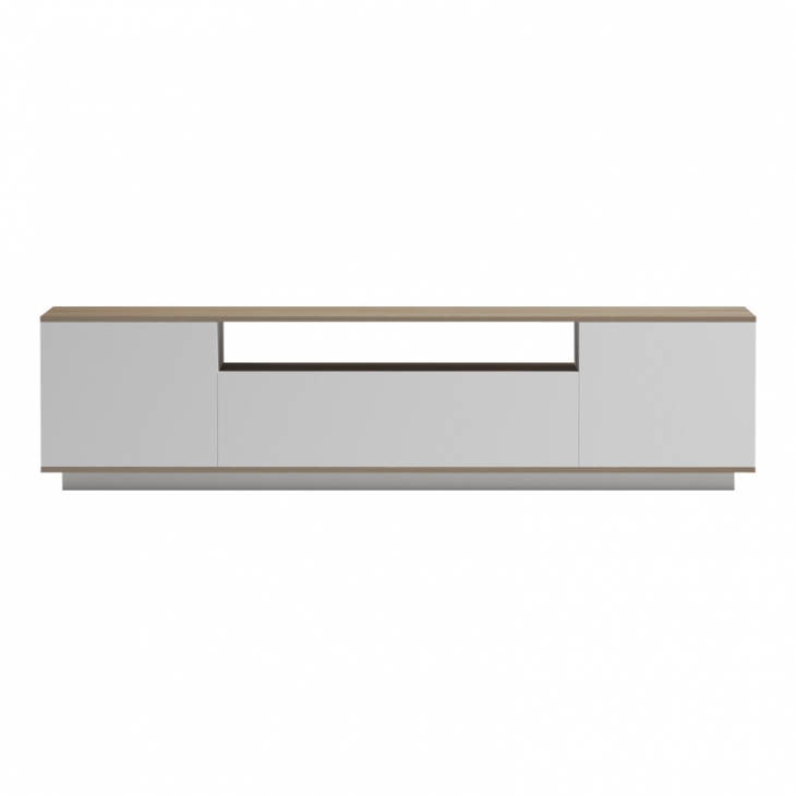 Αναβαθμίστε την ψυχαγωγική σας γωνιά με αυτό το σύγχρονο και ευέλικτο έπιπλο τηλεόρασης, σχεδιασμένο για να προσφέρει τόσο στυλ όσο και άφθονο αποθηκευτικό χώρο. Ο συνδυασμός του φωτεινού λευκού φινιρίσματος με τη ζεστή απόχρωση του ξύλου δημιουργεί μια αισθητική που ταιριάζει άψογα σε μοντέρνους και μινιμαλιστικούς χώρους.