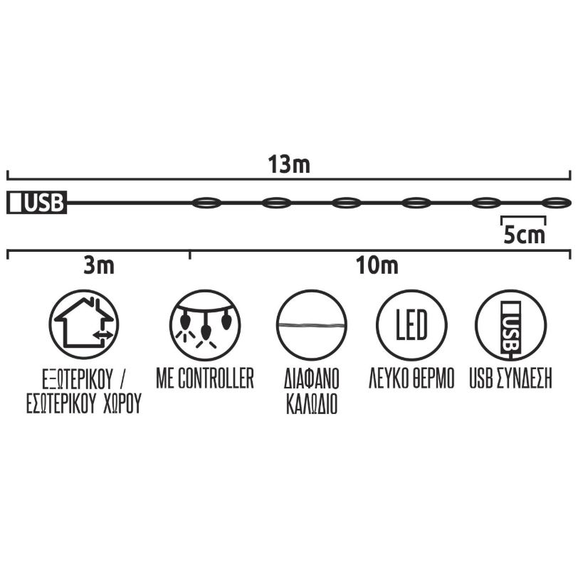 Λαμπάκια 200 Led με θερμό λευκό φως, USB σύνδεση με controller 8 προγράμματων, διάφανο καλώδιο 13μ. από την Xmas fest.