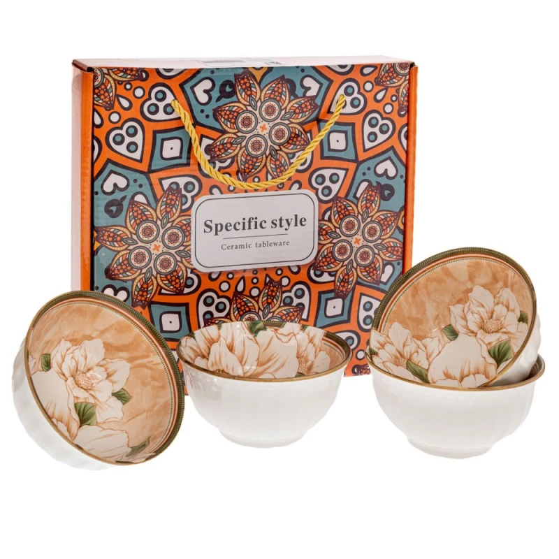 Σετ 4τμχ κεραμικά μπωλ με σχέδιο λουλούδια σε κρεμ χρώμα από την iliadis - Διαστάσεις: 11x6εκ.