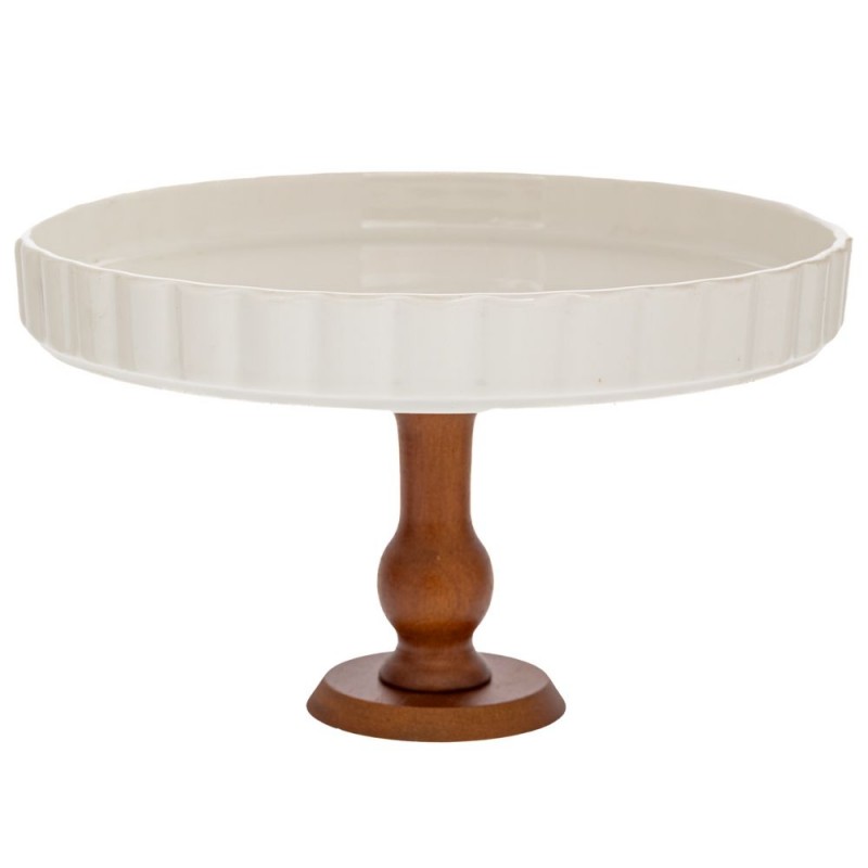 Δίσκος σερβιρίσματος κεραμικός με πόδι ξύλινο από bamboo σε λευκό - φυσικό χρώμα από την iliadis - Διαστάσεις: Φ27,5x16εκ.