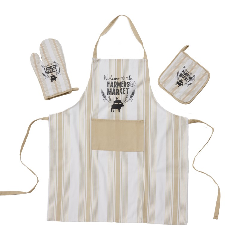 Σετ κουζίνας 3 τεμαχίων Das home. Το ύφσμα είναι από 100% βαμβάκι, υποαλλεργικό και πολύ ανθεκτικό στη χρήση. Το σετ αποτελείται από μία ποδιά 68x80εκ, ένα γάντι 18x30εκ και μία πιάστρα 20x20εκ. Ντύστε την κουζίνα σας με διακριτικά σχέδια και χρώματα. Das home...makes your house a home!