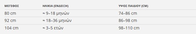 ΜεγεθοςΗλικια (ενδειξη)Υψος παιδιου (cm)