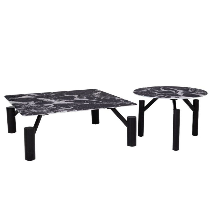 Σετ 2τμχ τραπεζάκια σαλονιού μεταλλικά σε μαύρο χρώμα με μαρμάρινη μαύρη επιφάνεια με λευκά νερά από την iliadis - Διαστάσεις: 90x90x35εκ./Φ60x35εκ.