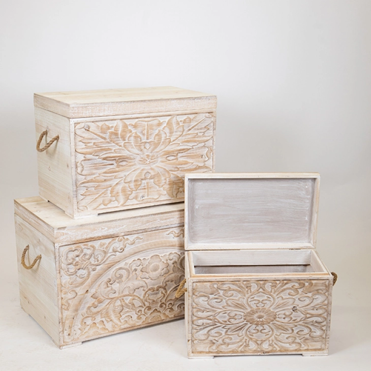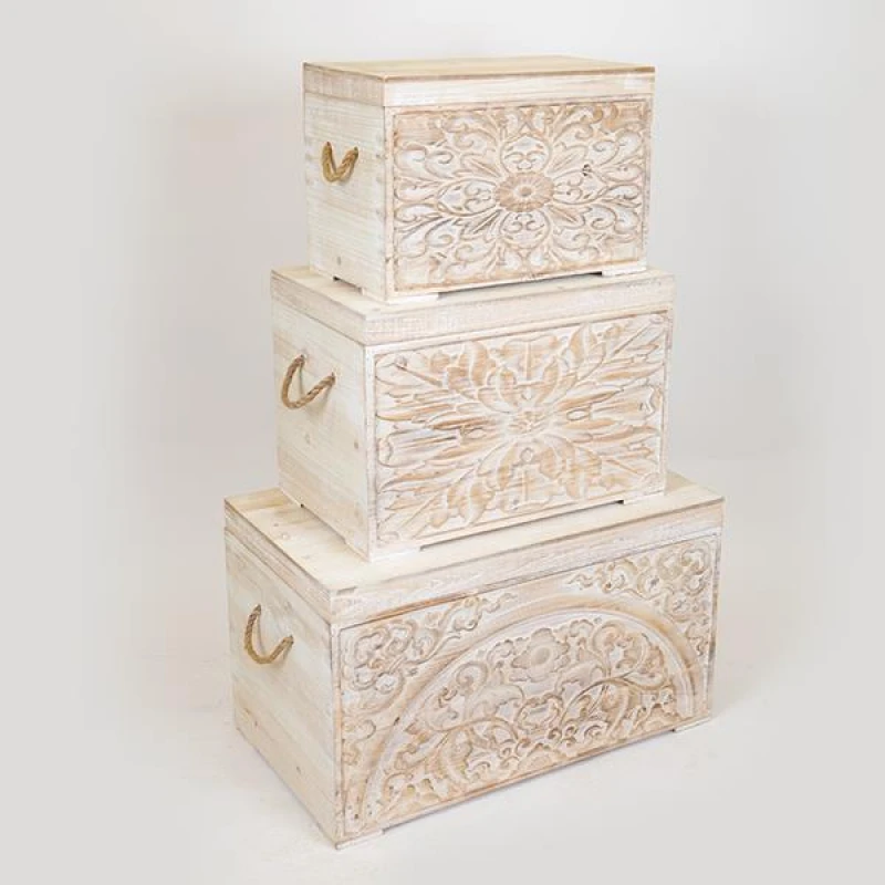 Σετ 3τμχ μπαούλα ξύλινα με σχέδια σε μπεζ - λευκό χρώμα από την ESTHETI - Διαστάσεις: 72x40,5x41εκ.-55,5x33,5x36,5εκ.-47,5x26,5x31εκ.