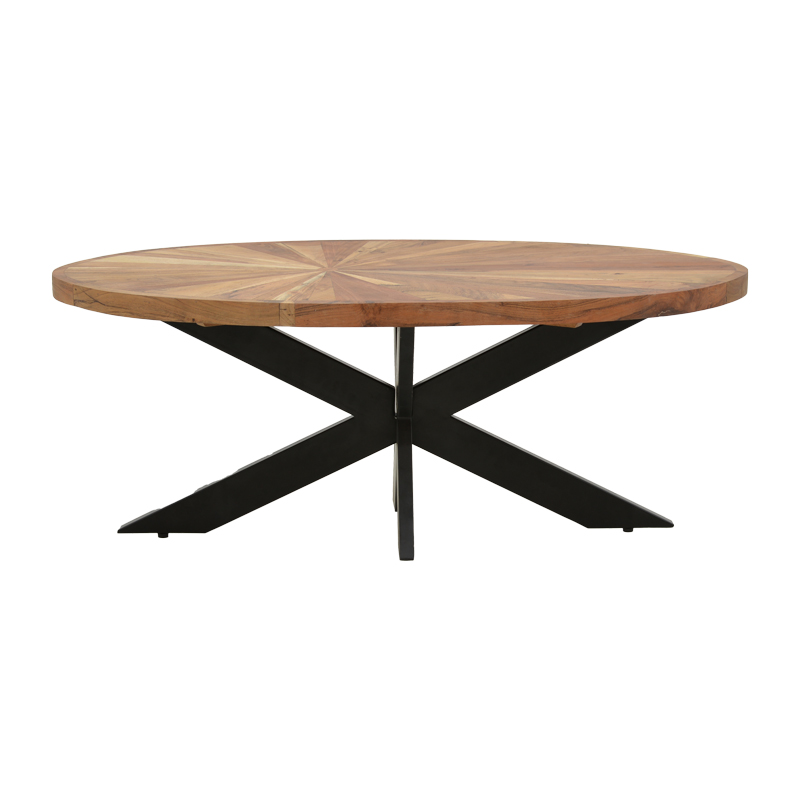 - Μοναδικός Σχεδιασμός: Η οβάλ επιφάνεια από μασίφ ξύλο, με το εντυπωσιακό ακτινωτό μοτίβο, προσδίδει μια αίσθηση ζεστασιάς και εκλεπτυσμένης ρουστίκ κομψότητας. Κάθε τραπέζι είναι μοναδικό, με τους φυσικούς κόκκους του ξύλου να αφηγούνται τη δική τους ιστορία.