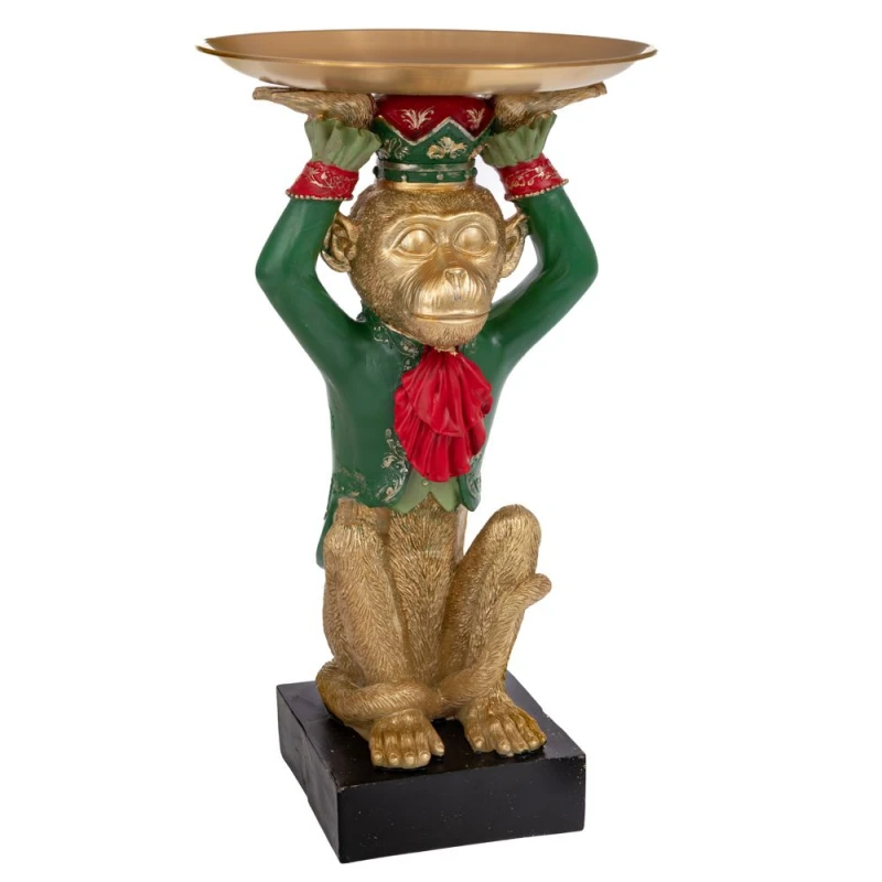 Διακοσμητική επιτραπέζια polyresin μαιμού χρυσή, καθιστή κρατώντας δίσκο με κοστούμι σε πράσινο και κόκκινο χρώμα από την iliadis - Διαστάσεις: 11x10x34εκ.
