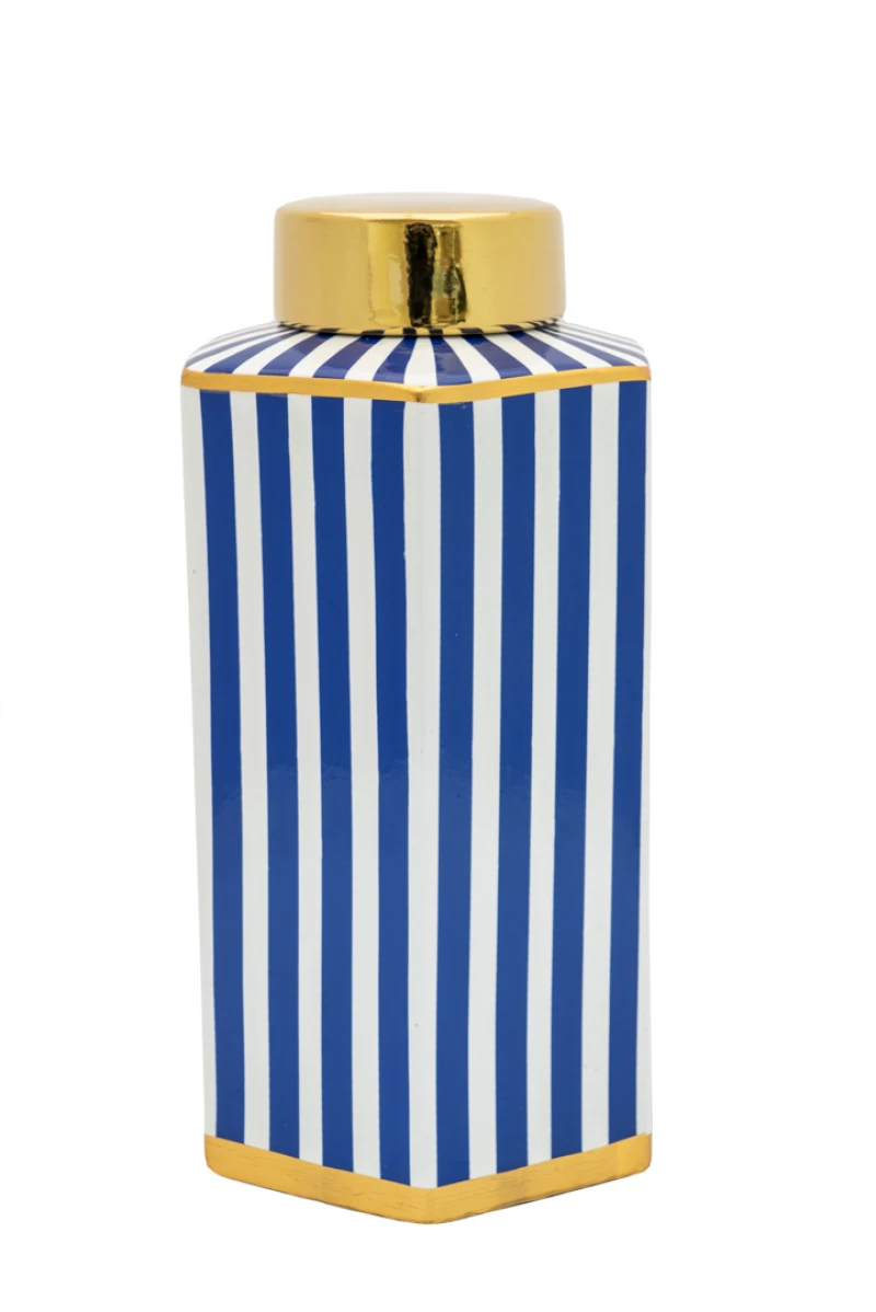 Βάζο κεραμικό, πολυγωνικό με μπλε-λευκές ρίγες και χρυσό καπάκι από την Zen Collection - Διαστάσεις: 15x13x28,5εκ.