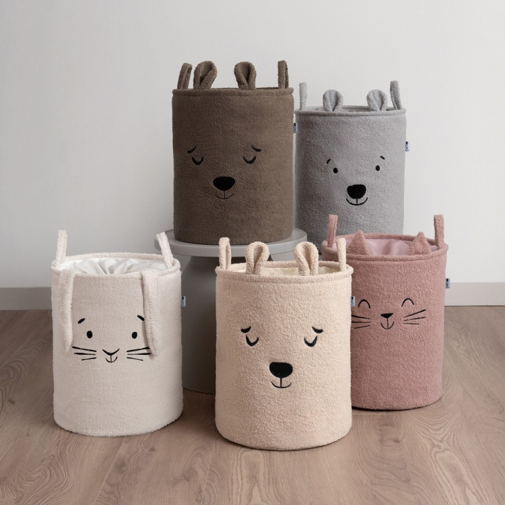 Με το απαλό ύφασμα μπουκλέ, τα φιλικά μοτίβα και τα ουδέτερα χρώματα, το καλάθι λειτουργεί όχι μόνο ως πρακτικός αποθηκευτικός χώρος, αλλά και ως ένα κομψό διακοσμητικό στοιχείο. Μπορεί να τοποθετηθεί ελεύθερα σε παιδικά δωμάτια, καθιστικά, υπνοδωμάτια ή μπάνια — χωρίς να διαταράσσει την αρμονία του χώρου.