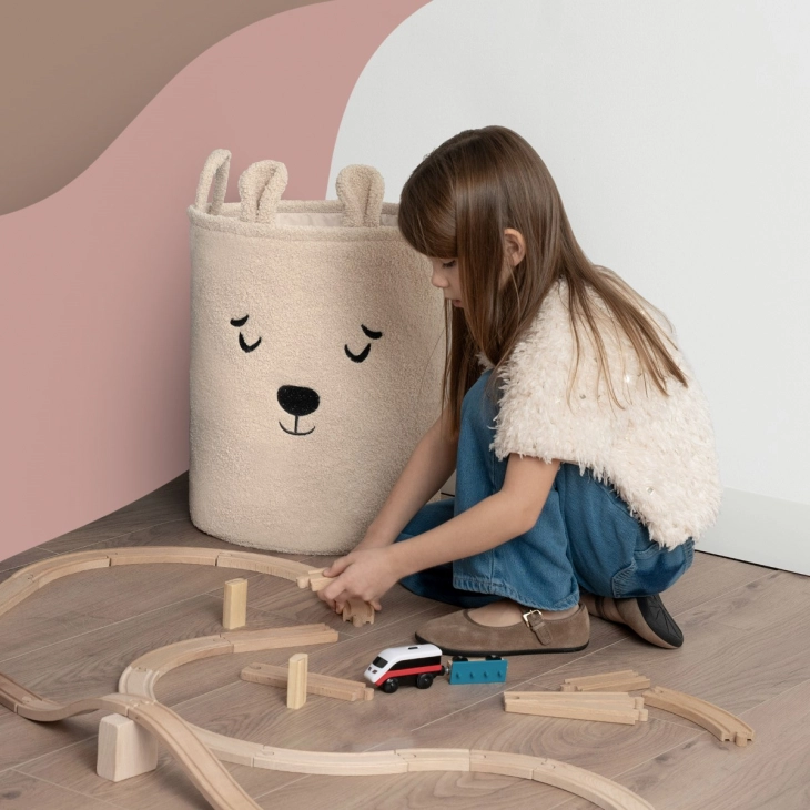 Με χωρητικότητα 43 λίτρων, το καλάθι είναι ιδανικό για χρήση στο παιδικό δωμάτιο, το σαλόνι, την κρεβατοκάμαρα ή το μπάνιο — παρέχοντας βολική αποθήκευση για παιχνίδια, υφάσματα και αξεσουάρ, χωρίς να επιβαρύνει οπτικά τον χώρο. Η εξωτερική στρώση είναι κατασκευασμένη από μαλακό, χνουδωτό ύφασμα μπουκλέ που προκαλεί φυσικά την αλληλεπίδραση. Τα φιλικά σχέδια με θέμα τα ζώα — όπως το αξιολάτρευτο αρκουδάκι — βοηθούν στην καλλιέργεια ενός συναισθηματικού δεσμού με το προϊόν, μετατρέποντας την τακτοποίηση σε παιχνίδι και όχι σε αγγαρεία.