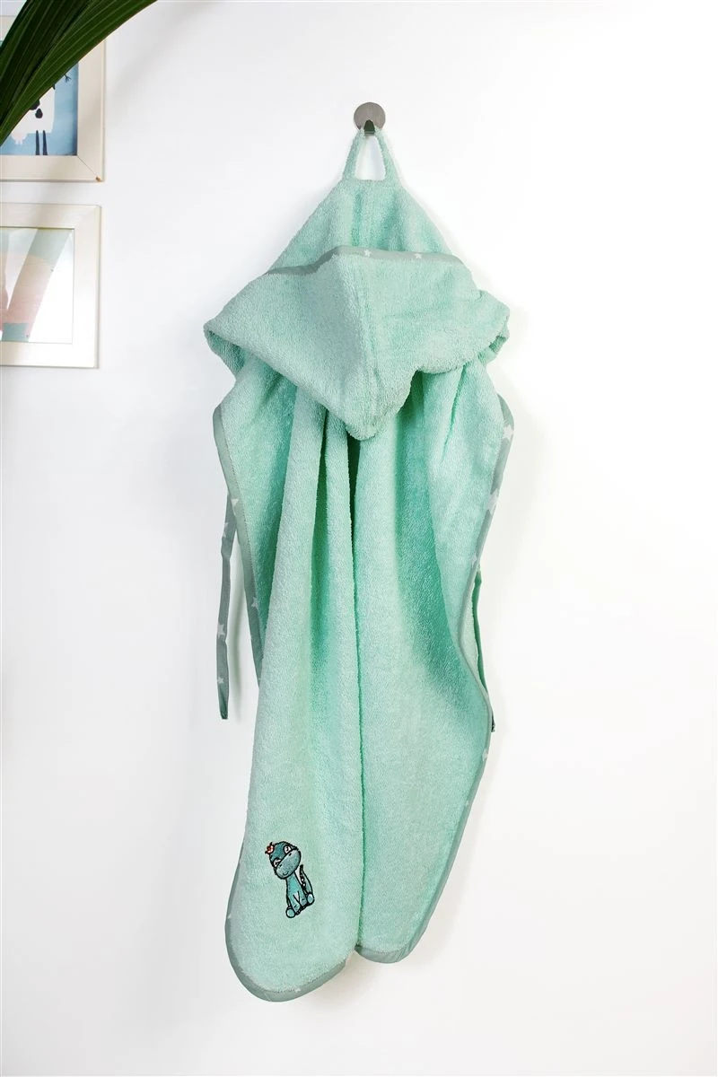 Βρεφική κάπα χρώματος μέντας διαστάσεων 75 x 85 cm, διακοσμημένη με χαριτωμένο κέντημα δεινοσαυράκι και χρωματιστό ρέλι με μοτίβο αστεράκια. Κατασκευασμένη από 100% βαμβακερή υποαλλεργική πετσέτα υψηλής απορροφητικότητας, βάρους 400 gr/m² ελεγμένη για επιβλαβείς ουσίες με το παγκοσμίως αναγνωρισμένο πιστοποιητικό, OEKO TEX® Standard 100. Η απαλή υφή της προσφέρει την ιδανική φροντίδα, ενώ η ενσωματωμένη κουκούλα κρατάει το κεφαλάκι του μωρού ζεστό. Συσκευασία δώρου: κουτί πολυτελείας.