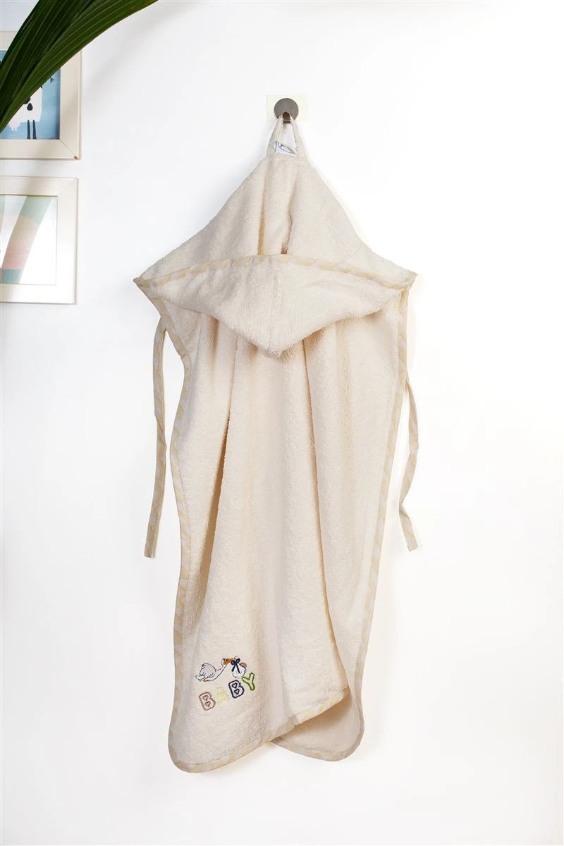 Βρεφική κάπα χρώματος εκρού διαστάσεων 75 x 85 cm, διακοσμημένη με χαριτωμένο κέντημα πελαργό και χρωματιστό ρέλι με μοτίβο συννεφάκια. Κατασκευασμένη από 100% βαμβακερή υποαλλεργική πετσέτα υψηλής απορροφητικότητας, βάρους 400 gr/m² ελεγμένη για επιβλαβείς ουσίες με το παγκοσμίως αναγνωρισμένο πιστοποιητικό, OEKO TEX® Standard 100. Η απαλή υφή της προσφέρει την ιδανική φροντίδα, ενώ η ενσωματωμένη κουκούλα κρατάει το κεφαλάκι του μωρού ζεστό. Συσκευασία δώρου: κουτί πολυτελείας.