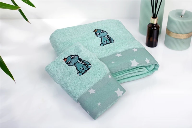 Βρεφικό σετ πετσέτες 2 τεμαχίων χρώματος μέντας το οποίο περίεχει: 1 πετσέτα χειρός/προσώπου διαστάσεων 30 x 50 cm και 1 πετσέτα μπανίου διαστάσεων 70 x 140 cm. Οι πετσέτες είναι διακοσμημένες με χαριτωμένο κέντημα δεινοσαυράκι και χρωματιστή φάσα με μοτίβο αστεράκια. Κατασκευασμένη από 100% βαμβακερή υποαλλεργική πετσέτα υψηλής απορροφητικότητας, βάρους 400 gr/m² ελεγμένη για επιβλαβείς ουσίες με το παγκοσμίως αναγνωρισμένο πιστοποιητικό, OEKO TEX® Standard 100. Η απαλή υφή τους προσφέρει την ιδανική φροντίδα για το μωρό, από τις πρώτες του μέρες. Συσκευασία δώρου: κουτί πολυτελείας.