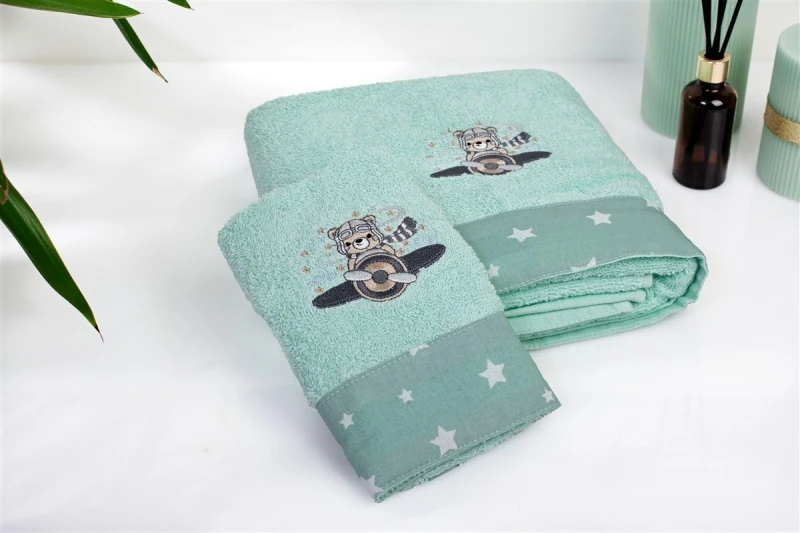 Βρεφικό σετ πετσέτες 2 τεμαχίων χρώματος μέντας το οποίο περίεχει: 1 πετσέτα χειρός/προσώπου διαστάσεων 30 x 50 cm και 1 πετσέτα μπανίου διαστάσεων 70 x 140 cm. Οι πετσέτες είναι διακοσμημένες με χαριτωμένο κέντημα αεροπόρο και χρωματιστή φάσα με μοτίβο αστεράκια. Κατασκευασμένη από 100% βαμβακερή υποαλλεργική πετσέτα υψηλής απορροφητικότητας, βάρους 400 gr/m² ελεγμένη για επιβλαβείς ουσίες με το παγκοσμίως αναγνωρισμένο πιστοποιητικό, OEKO TEX® Standard 100. Η απαλή υφή τους προσφέρει την ιδανική φροντίδα για το μωρό, από τις πρώτες του μέρες. Συσκευασία δώρου: κουτί πολυτελείας.