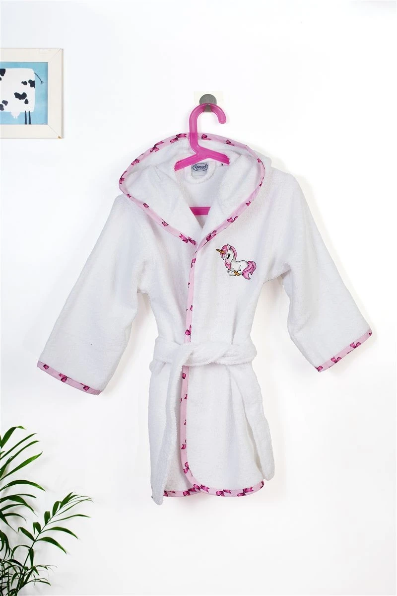 Παιδικό μπουρνούζι χρώματος λευκού με κουκούλα, κατάλληλο για ηλικίες 2-3 ετών, διακοσμημένο με χαριτωμένο κέντημα μονόκερο και χρωματιστό ρέλι με μοτίβο κορδελίτσες. Κατασκευασμένο από 100% βαμβακερή υποαλλεργική πετσέτα υψηλής απορροφητικότητας, βάρους 400 gr/m² ελεγμένη για επιβλαβείς ουσίες με το παγκοσμίως αναγνωρισμένο πιστοποιητικό, OEKO TEX® Standard 100. Η απαλή και αφράτη υφή του προσφέρει την ιδανική φροντίδα μετά το μπάνιο, ενώ η ενσωματωμένη κουκούλα κρατάει το κεφαλάκι του παιδιού ζεστό. Συσκευασία δώρου: κουτί πολυτελείας.