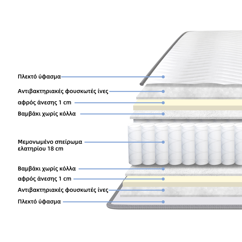 - Pocket Spring 18εκ: Πυρήνας στήριξης από ανεξάρτητα ελατήρια ύψους 18cm, κατασκευασμένα από ατσάλινο σύρμα 1.8mm. Διαθέτει επιπλέον ενίσχυση με δύο εξωτερικούς πυλώνες 2.2mm για αυξημένη σταθερότητα. Εξασφαλίζει ελάχιστη μεταφορά κίνησης ώστε να μην ενοχλείστε από τις κινήσεις του/της συντρόφου σας.
