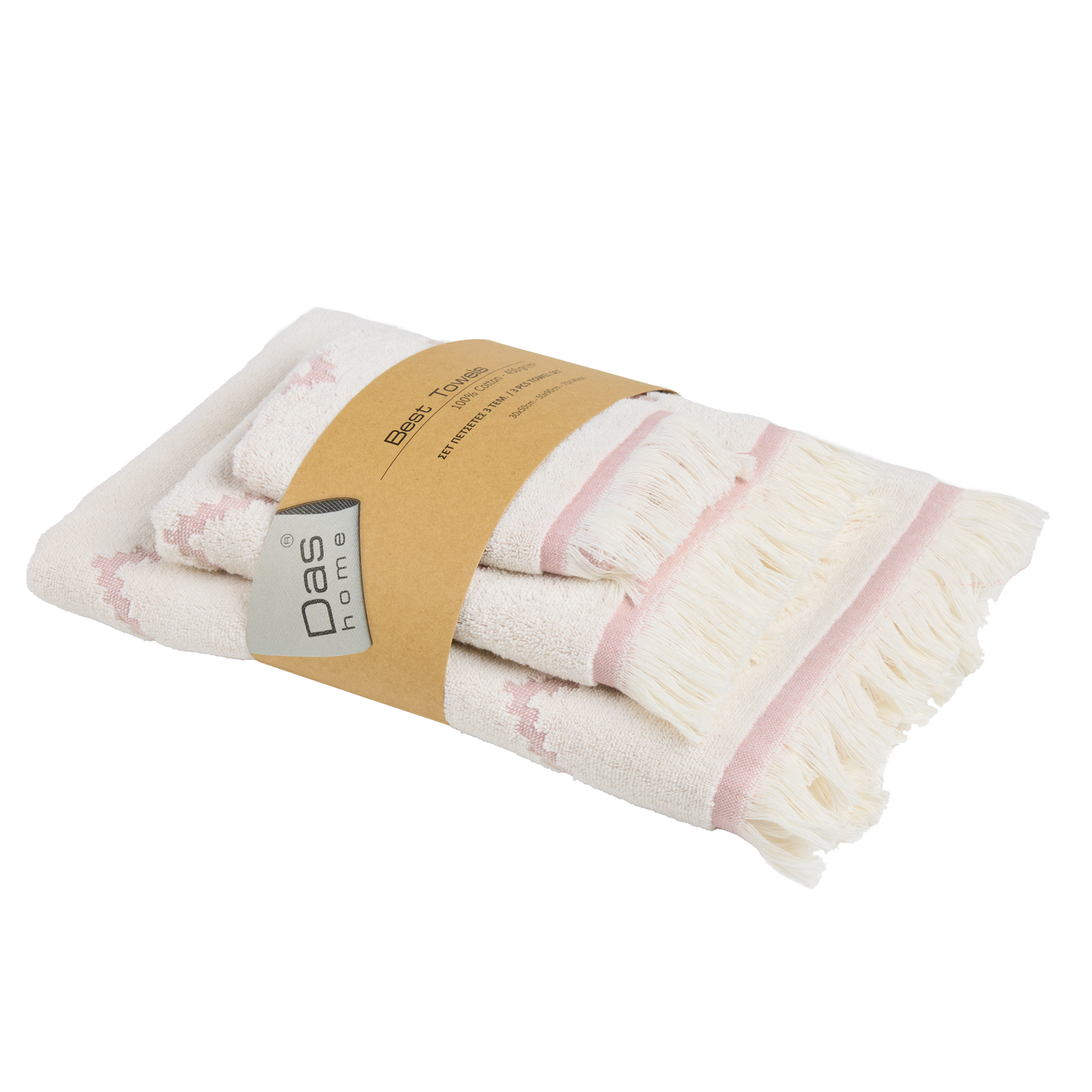 Σετ πετσέτες 3 τεμαχίων της σειράς Best, με κρόσια. Είναι από 100% βαμβάκι υψηλής ποιότητας, ιδιαίτερα απαλές, απορροφητικές και ανθεκτικές στην χρήση με βάρος 450gr/m2. Τα χρώματα που χρησιμοποιούνται είναι ανεξίτηλα και υποαλλεργικά. Το σετ αποτελείται από μία πετσέτα μπάνιου 70Χ140εκ., μία πετσέτα προσώπου 50Χ90εκ. και μία πετσέτα χεριών 30Χ50εκ. Das home...makes your house a home!