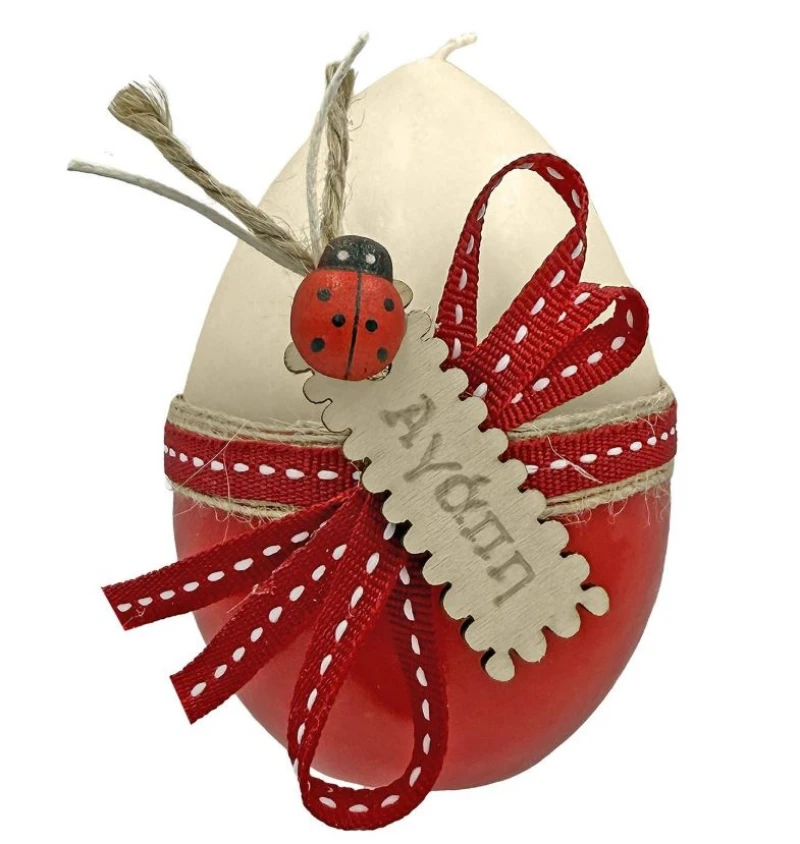 Κερί αυγό σε λευκό - κόκκινο χρώμα, με σχέδιο πασχαλίτσα και επιγραφή αγάπη από την Bunny's - Διαστάσεις: 9εκ.