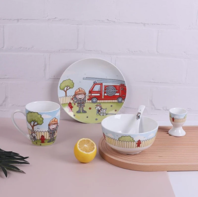 Παιδικό σετ φαγητού 5τμχ πορσελάνης με σχέδιο πυροσβέστη από την CRYSPO TRIO - Το σετ περιλαμβάνει: πιάτο φαγητού, μπωλ, αυγοθήκη, κούπα, κουτάλι.
