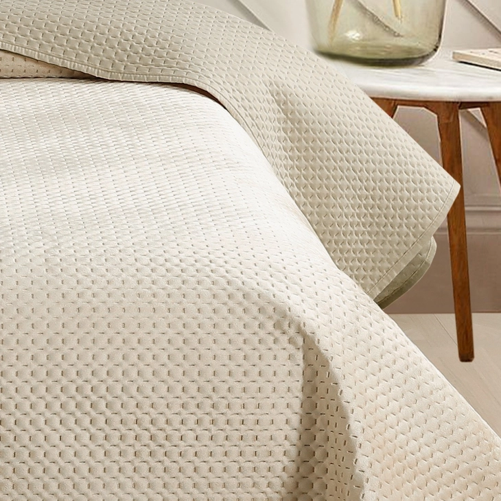 Κουβερλί μονόχρωμο Omnia της Melinen κατασκευασμένο από ύφασμα 100% velvet polyester και πολυεστερική γέμιση 100 gsm. Είναι ένα ελαφρύ σκέπασμα, ιδανικό για άνοιξη και φθινόπωρο, δίνει μια εξαιρετικά απαλή αίσθηση και είναι ανθεκτικό στις συχνές πλύσεις και στο χρόνο. Διατίθεται σε τρεις μοντέρνες αποχρώσεις και τέσσερις διαστάσεις.