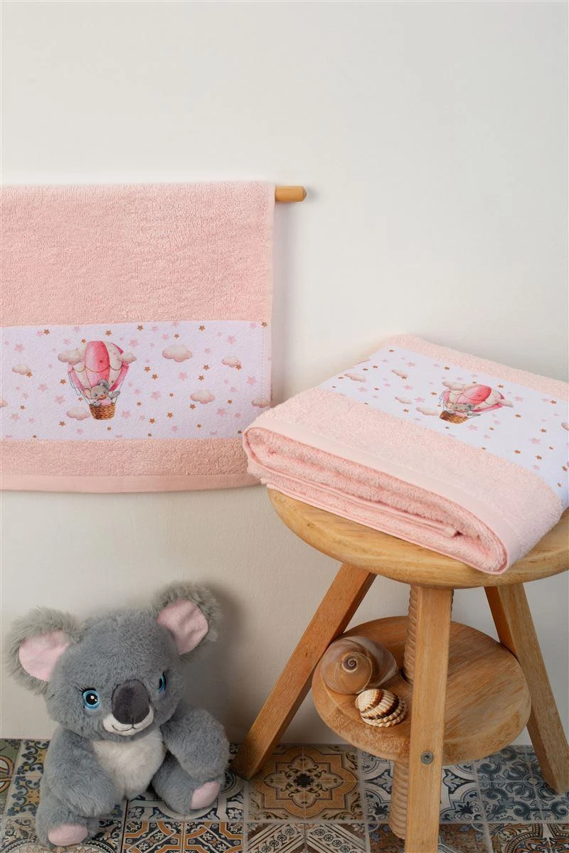 Σετ βρεφικές πετσέτες μπάνιου που περιέχει : 1 τεμάχιο πετσέτα χειρός διαστάσεων 30X50 cm και 1 τεμάχιο πετσέτα μπάνιου διαστάσεων 70X140 cm. Οι πετσέτες έχουν υφασμάτινη φάσα με ψηφιακά τυπωμένα χρωματιστά σχέδια και είναι κατασκευασμένες από 100% βαμβάκερη πετσέτα 400 gsm, υψηλής απορροφητικότητας. Συσκευασία Δώρου Κουτί Πολυτελείας.