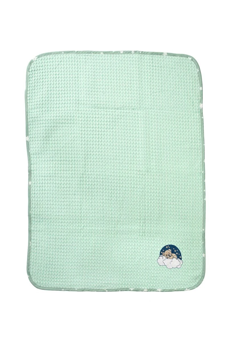Βρεφική κουβέρτα πικέ αγκαλιάς με ανάγλυφο σχέδιο βάφλα, χρώματος μέντας, διαστάσεων 80 x 110 cm, διακοσμημένη με χαριτωμένο κέντημα κοιμώμενο αρκουδάκι και χρωματιστό ρέλι με μοτίβο αστεράκια. Κατασκευασμένη από 100% βαμβακερό, υποαλλεργικό woven πικέ ύφασμα βάρους 325 gr/m². Χάρη στην εξαιρετικά απαλή υφή της, αγκαλιάζει το μωρό σας με άνεση, ενώ η ιδιαίτερη ύφανση βάφλα επιτρέπει στο δέρμα να αναπνέει, καθιστώντας την ιδανική επιλογή για την άνοιξη και το καλοκαίρι. Συσκευασία δώρου: κουτί πολυτελείας. Η κουβέρτα είναι ελεγμένη για επιβλαβείς ουσίες με το παγκοσμίως αναγνωρισμένο πιστοποιητικό OEKO-TEX® Standard 100.