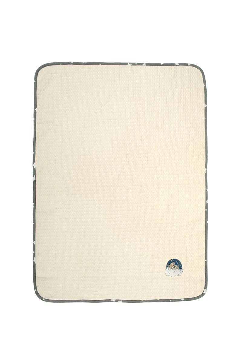 Βρεφική κουβέρτα πικέ κούνιας με ανάγλυφο σχέδιο βάφλα, χρώματος εκρού, διαστάσεων 100 x 160 cm, διακοσμημένη με χαριτωμένο κέντημα κοιμώμενο αρκουδάκι και χρωματιστό ρέλι με μοτίβο αστεράκια. Κατασκευασμένη από 100% βαμβακερό, υποαλλεργικό woven πικέ ύφασμα βάρους 325 gr/m². Χάρη στην εξαιρετικά απαλή υφή της, αγκαλιάζει το μωρό σας με άνεση, ενώ η ιδιαίτερη ύφανση βάφλα επιτρέπει στο δέρμα να αναπνέει, καθιστώντας την ιδανική επιλογή για την άνοιξη και το καλοκαίρι. Συσκευασία δώρου: κουτί πολυτελείας. Η κουβέρτα είναι ελεγμένη για επιβλαβείς ουσίες με το παγκοσμίως αναγνωρισμένο πιστοποιητικό OEKO-TEX® Standard 100.