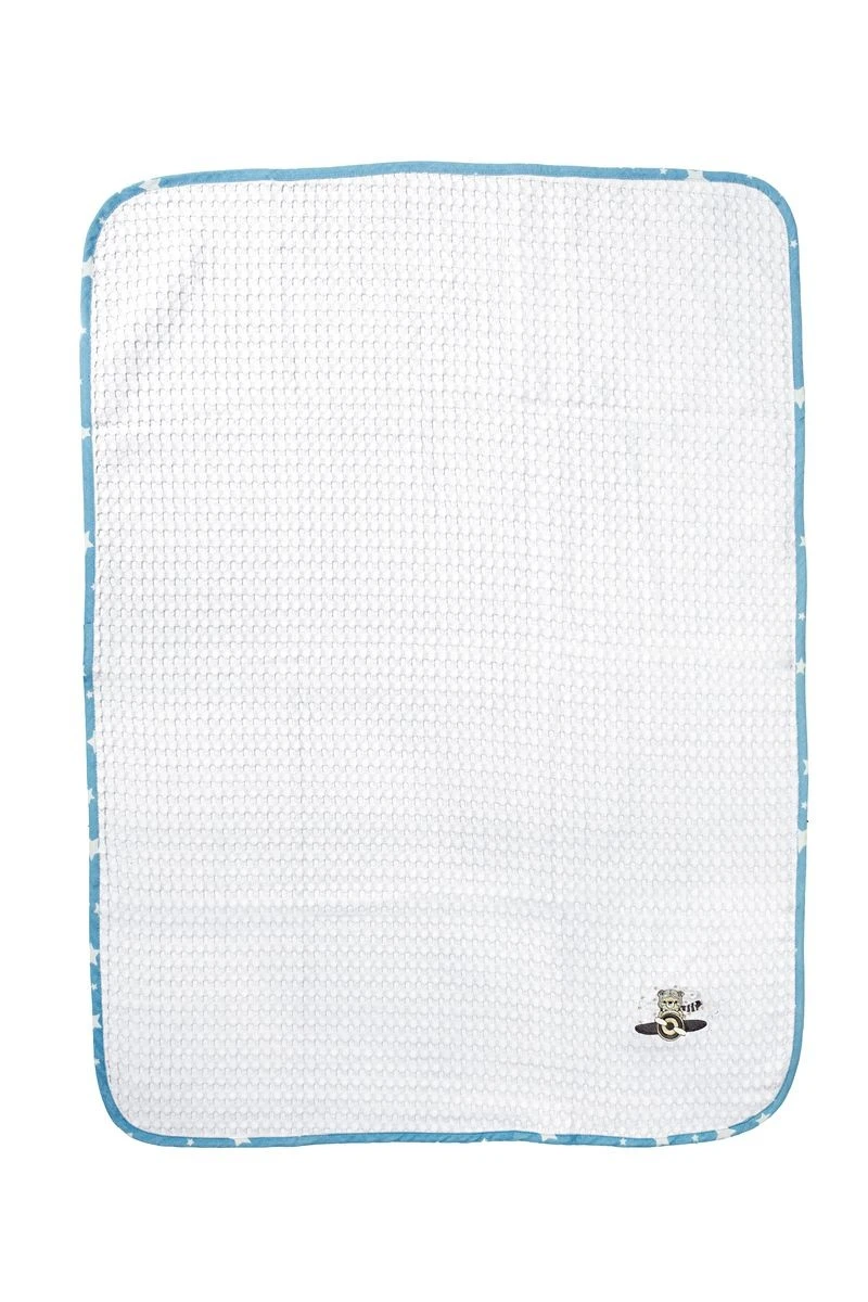 Βρεφική κουβέρτα πικέ κούνιας με ανάγλυφο σχέδιο βάφλα, χρώματος λευκού, διαστάσεων 100 x 160 cm, διακοσμημένη με χαριτωμένο κέντημα αεροπόρο και χρωματιστό ρέλι με μοτίβο αστεράκια. Κατασκευασμένη από 100% βαμβακερό, υποαλλεργικό woven πικέ ύφασμα βάρους 325 gr/m². Χάρη στην εξαιρετικά απαλή υφή της, αγκαλιάζει το μωρό σας με άνεση, ενώ η ιδιαίτερη ύφανση βάφλα επιτρέπει στο δέρμα να αναπνέει, καθιστώντας την ιδανική επιλογή για την άνοιξη και το καλοκαίρι. Συσκευασία δώρου: κουτί πολυτελείας. Η κουβέρτα είναι ελεγμένη για επιβλαβείς ουσίες με το παγκοσμίως αναγνωρισμένο πιστοποιητικό OEKO-TEX® Standard 100.