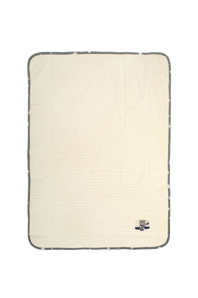 Βρεφική κουβέρτα πικέ κούνιας με ανάγλυφο σχέδιο βάφλα, χρώματος εκρού, διαστάσεων 100 x 160 cm, διακοσμημένη με χαριτωμένο κέντημα αεροπόρο και χρωματιστό ρέλι με μοτίβο αστεράκια. Κατασκευασμένη από 100% βαμβακερό, υποαλλεργικό woven πικέ ύφασμα βάρους 325 gr/m². Χάρη στην εξαιρετικά απαλή υφή της, αγκαλιάζει το μωρό σας με άνεση, ενώ η ιδιαίτερη ύφανση βάφλα επιτρέπει στο δέρμα να αναπνέει, καθιστώντας την ιδανική επιλογή για την άνοιξη και το καλοκαίρι. Συσκευασία δώρου: κουτί πολυτελείας. Η κουβέρτα είναι ελεγμένη για επιβλαβείς ουσίες με το παγκοσμίως αναγνωρισμένο πιστοποιητικό OEKO-TEX® Standard 100.