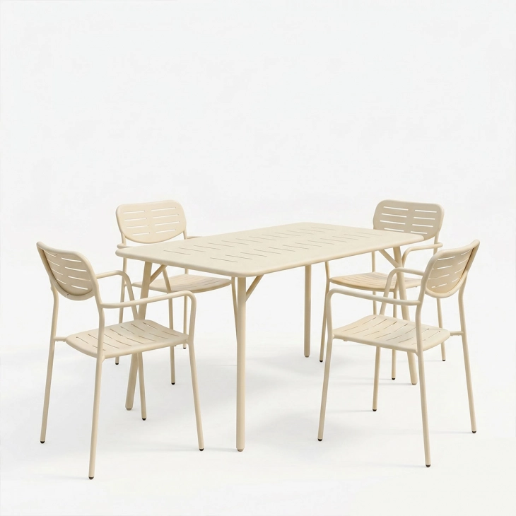 Ανανεώστε τον εξωτερικό σας χώρο με ένα σετ τραπεζαρίας που συνδυάζει την υψηλή αισθητική με την απόλυτη εργονομία. Το σετ περιλαμβάνει το ευρύχωρο τραπέζι Moraja και τέσσερις αναπαυτικές, στοιβαζόμενες πολυθρόνες Deraby, όλα σε μια γλυκιά κρεμ απόχρωση που προσδίδει φως και αίσθηση καθαρότητας σε κάθε κήπο, βεράντα ή αυλή.